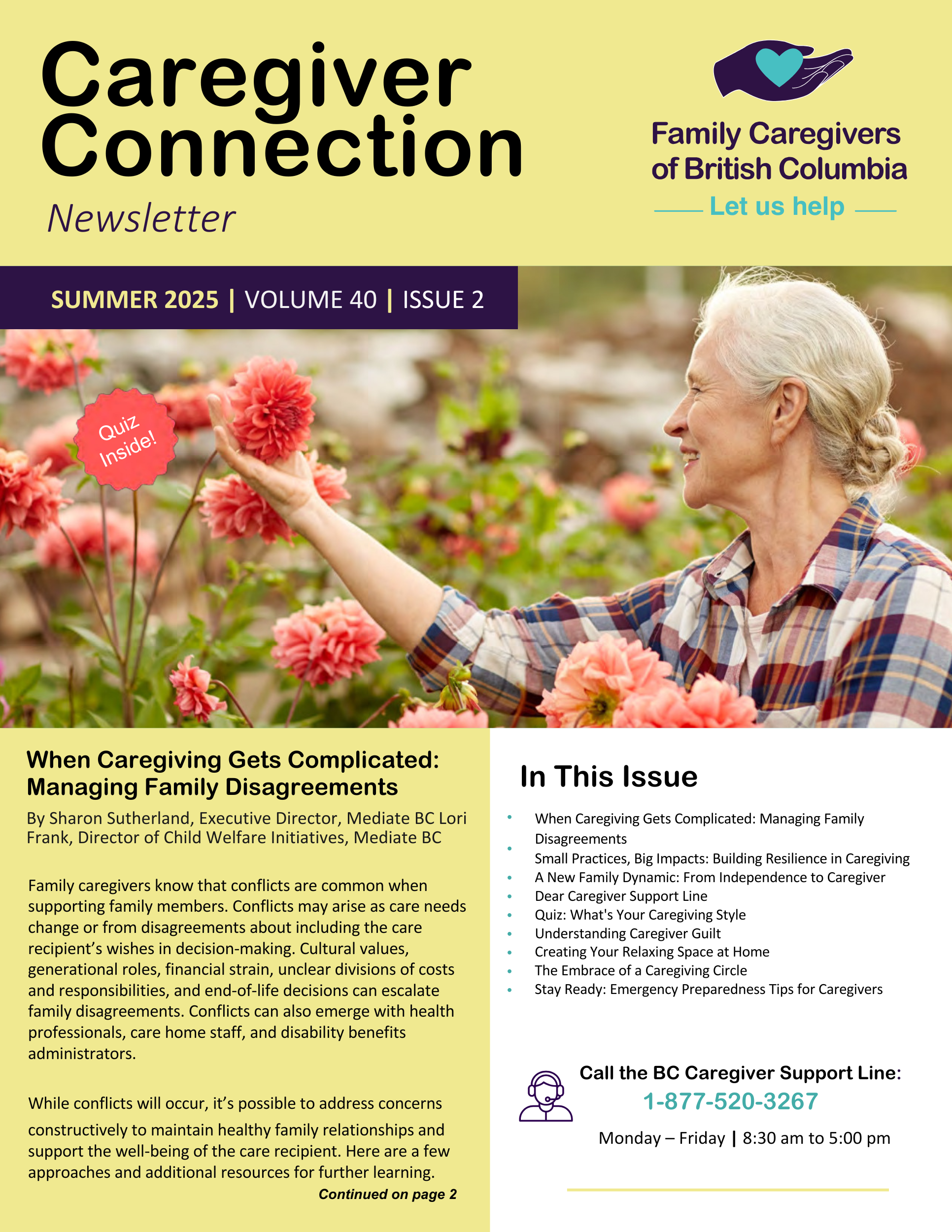 Caregiver Connection is a free quarterly newsletter published by the Family Caregivers of BC. It contains interesting and informative articles directly related to caregiving issues that help build a stronger caregiver community. If you currently receive a copy of Caregiver Connection by mail and would prefer to receive it by email, click here to email us and change your preference.